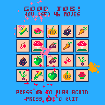 Gameplay is simple: use arrow keys to select a card, and open it with 🅾️-key (z-key on keyboard). Try to find all pairs with least amount of card flips.